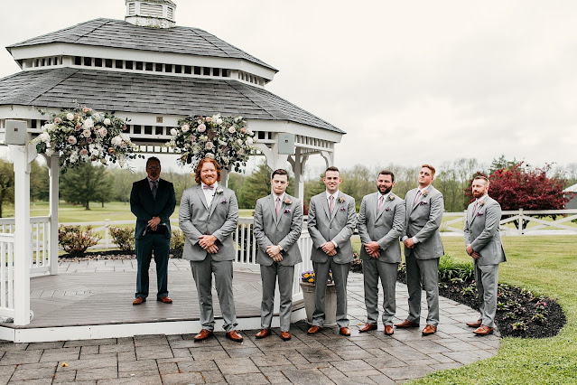 The groom and groomsmen wore gray suits which went with the soft colors of the day so well. We utilized umbrellas for most of their bridal party photos which gave us some fun photos!